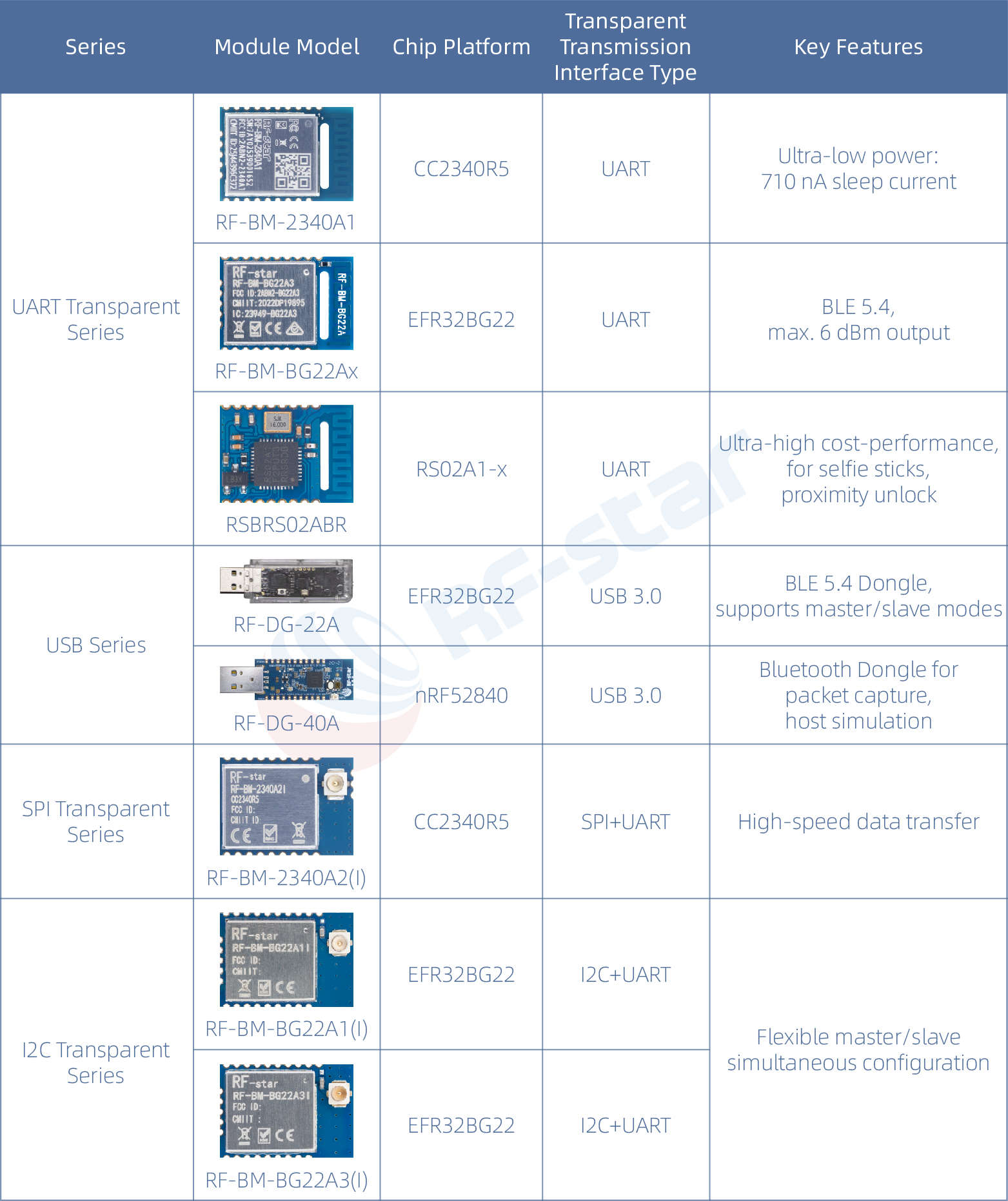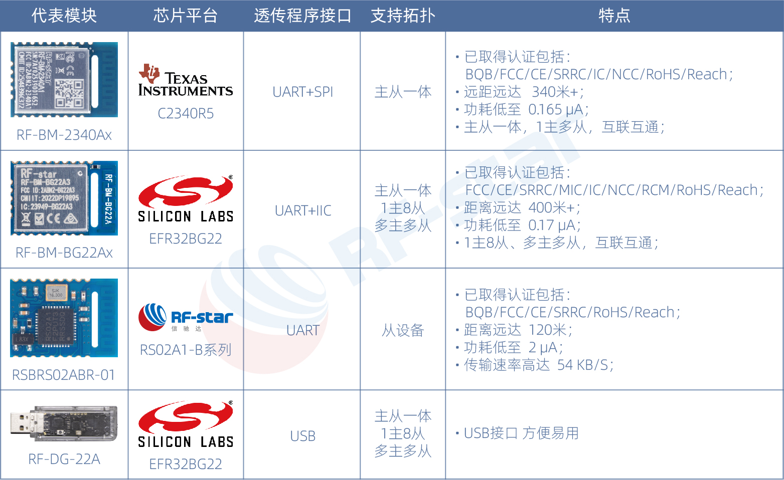 SPI/I2Cタイプ: シリアル伝送速度の違い。たとえば、RF-BM-2340A2 は SPI 透過伝送プロトコルをサポートし、RF-BM-BG22Ax は I2C 透過伝送プロトコルをサポートします。