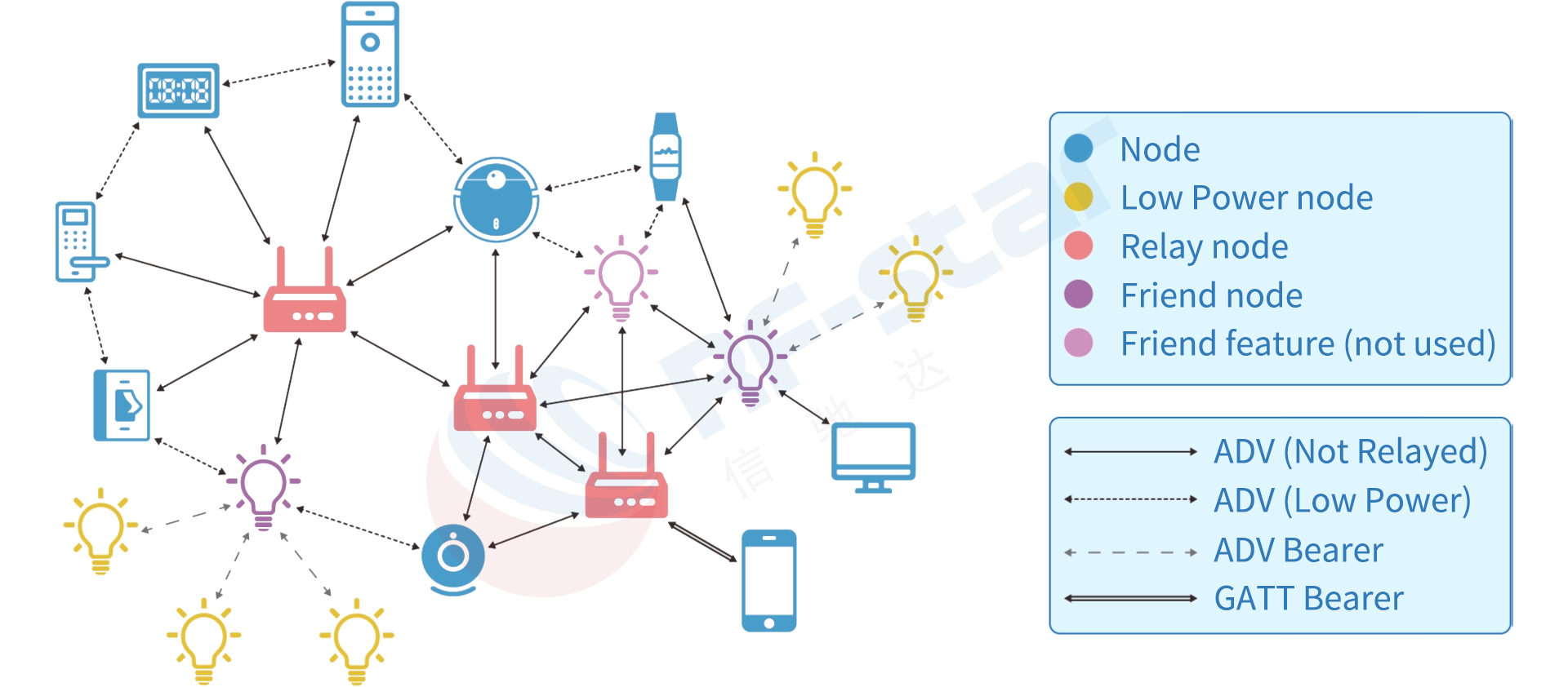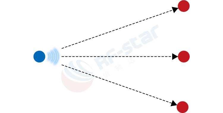 Bluetooth メッシュ ネットワーク 1 対多: 「フラッディング」型のネットワーク管理アプローチを採用しています。メッセージを受信した各ノードは、他のノードを経由してメッセージを転送し、ターゲットノードが受信するまでリレーします。理論上、ネットワークは数万ノードを収容でき、多対多の通信を可能にします。しかし、ネットワークは複雑であり、消費電力とレイテンシを制御することが困難です。