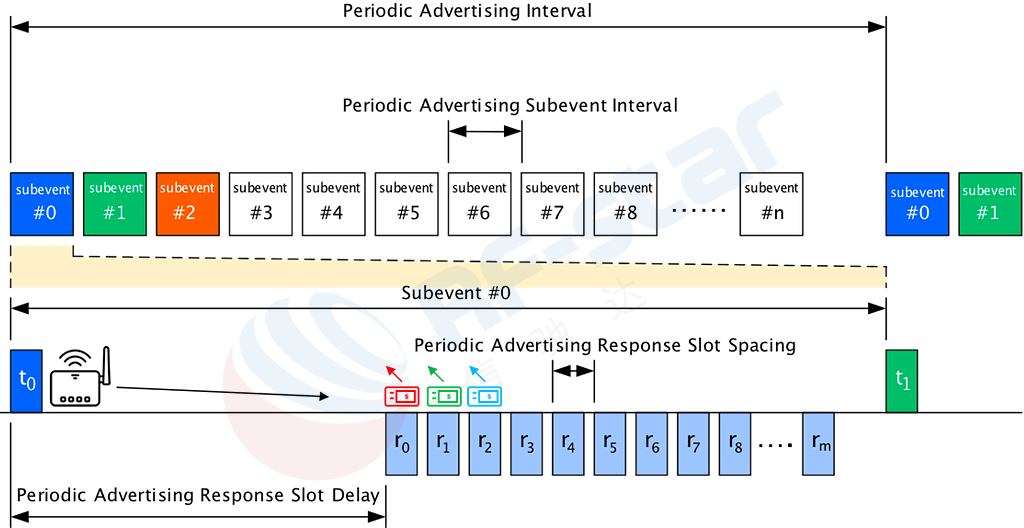 ブロードキャスターは、特定のタイミング情報を含む定期的なアドバタイジングストリームを継続的に送信します。数千台のサブスクライバーデバイスはこのアドバタイジングストリームをリッスンし、ブロードキャスターのタイミングと正確に同期しています。サブスクライバーデバイスは、通信に割り当てられた特定の時間枠を認識しています。